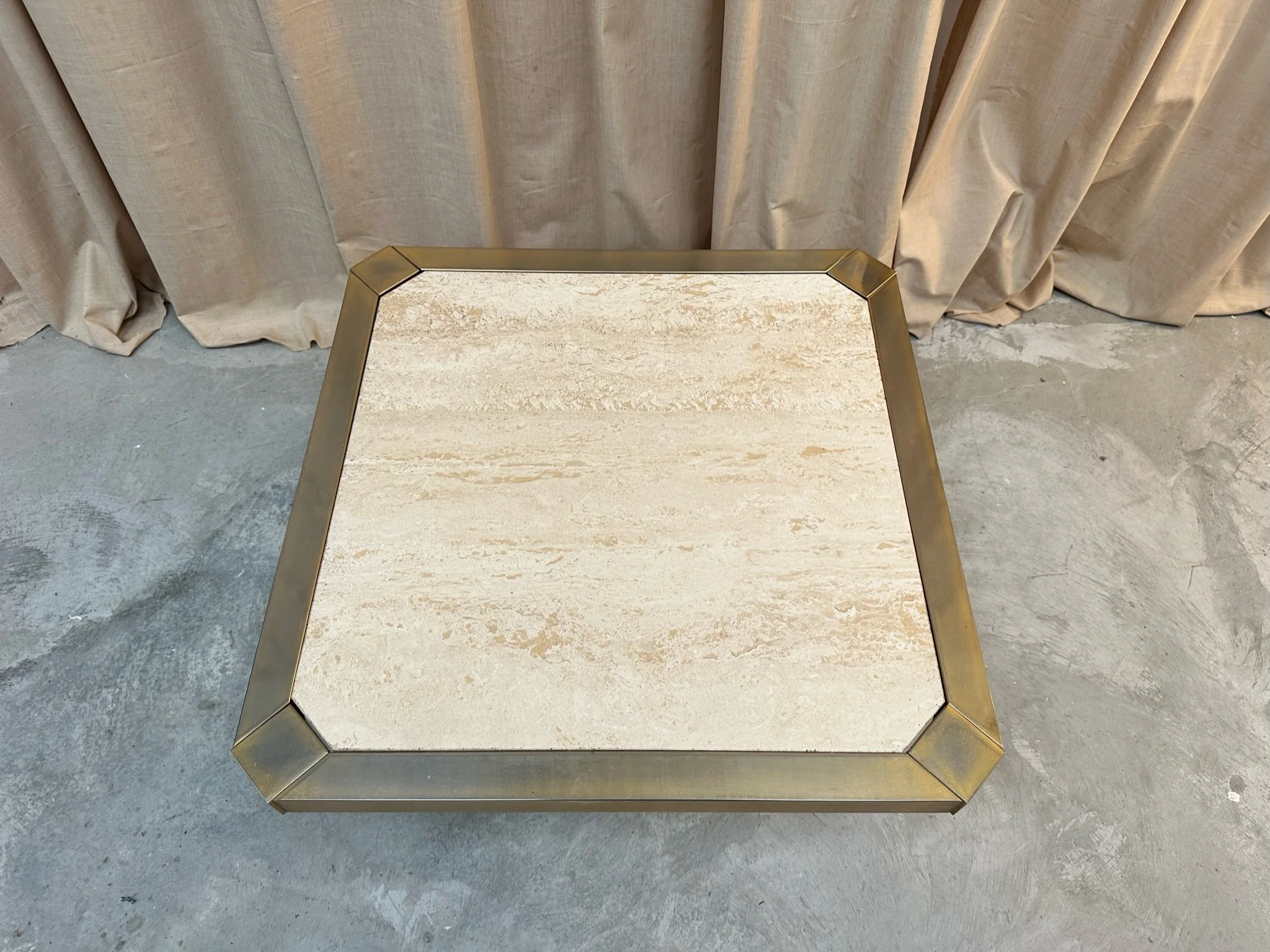 Travertine coffee, side or lamp table with gold trim. The manufacturer is Fedam, made in the 1970s to 80s. It’s a beaut, the gold trim around the table has some wear but still looks ace in my opinion, it’s a great size not too big.