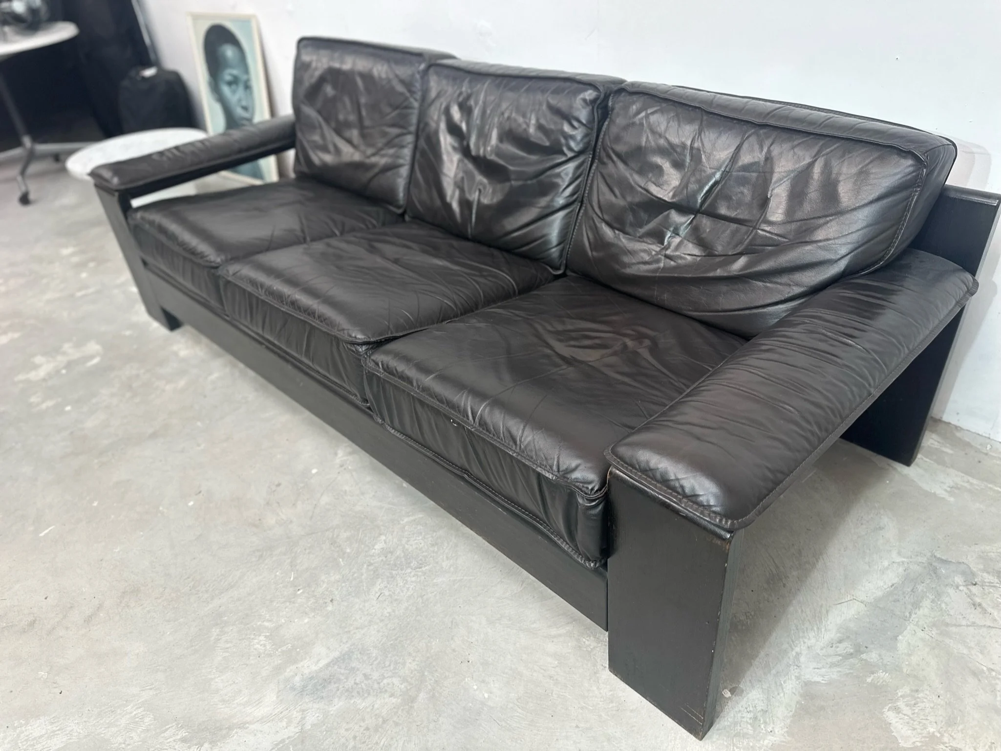 This is a vintage retro 3-seater sofa designed by Harry de Groot for Leolux. The sofa has a brutalist style with brown leather upholstery.