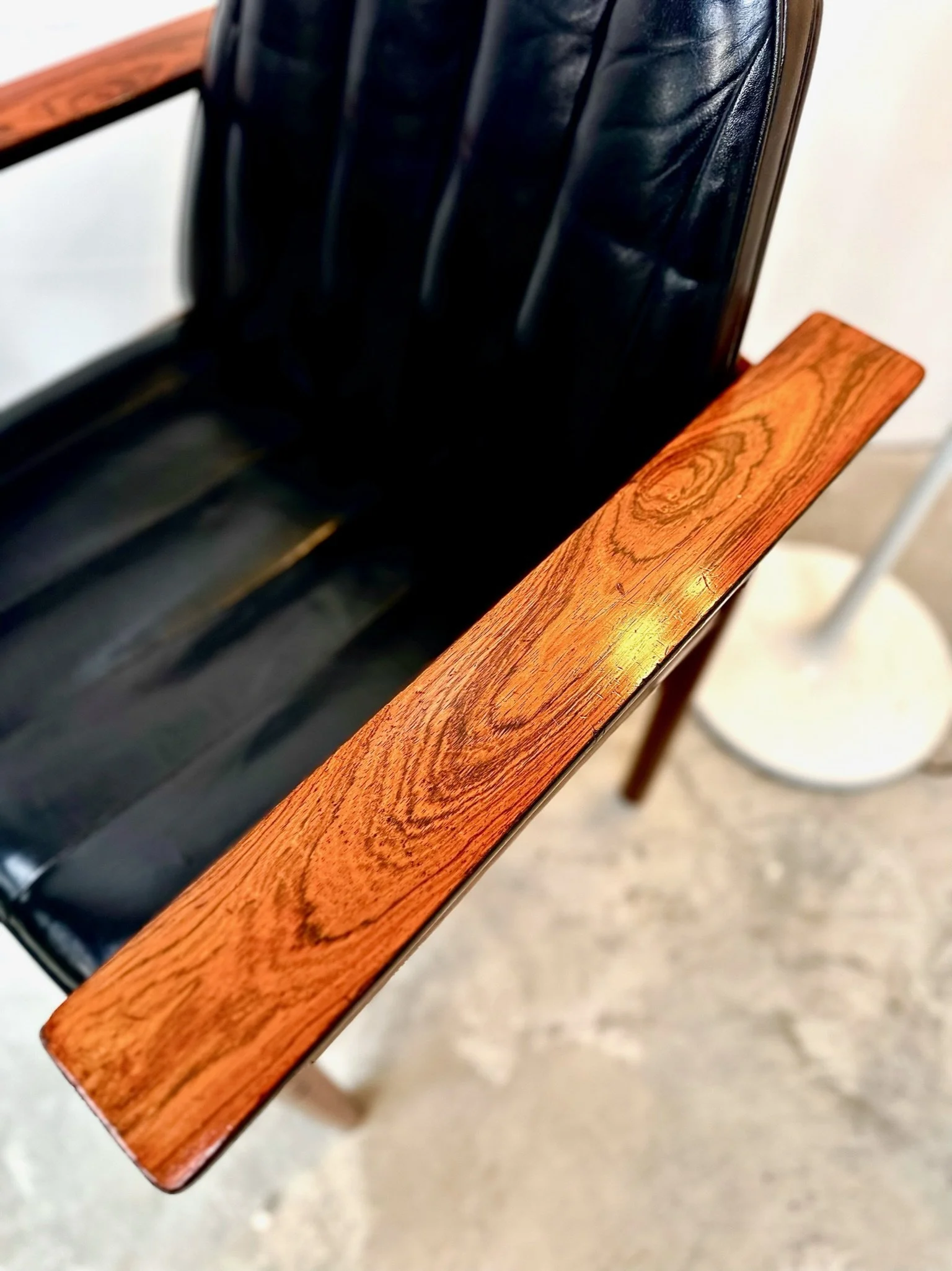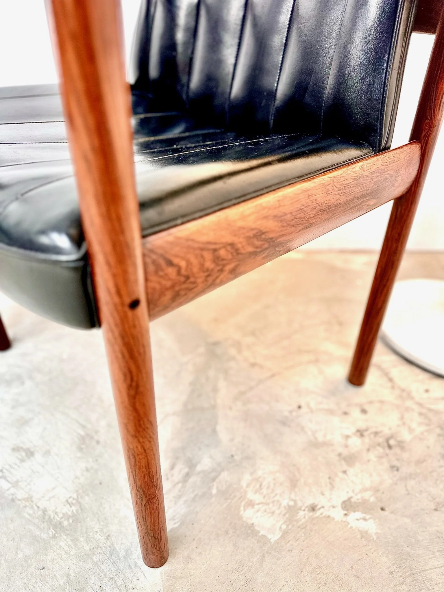 A pair of 1960s lounge chairs with a stunning rosewood frame and leather upholstery. The frame has been French polished, and the leather cleaned and polished. We have also replaced the foams in the seat bases, so these chairs are in impeccable condition.